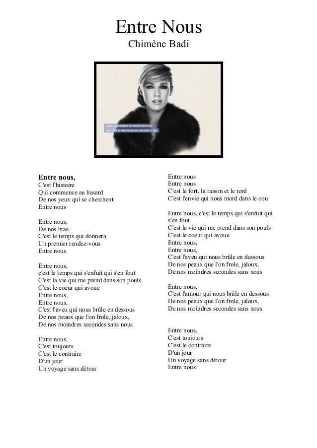 Entre nous, c'est l'histoire qui commence au hasard de nos yeux qui se cherchent entre nous. Перевод песни entre nous — рейтинг: D7 d(sus4) d7 de la moindre seconde sans vous. Chimène badi — entre nous. Released as her debut single in january 2003 from the album of the same name on which it features as the first track, it allowed badi to achieve success in france where it topped the chart.